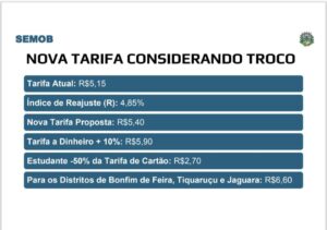 O novo valor também atinge os distritos mais distantes da sede do município. Bonfim de Feira, Tiquaruçu e Jaguara passam a ter tarifa de R$ 6,60, conforme previsto no decreto que será publicado após a sanção.